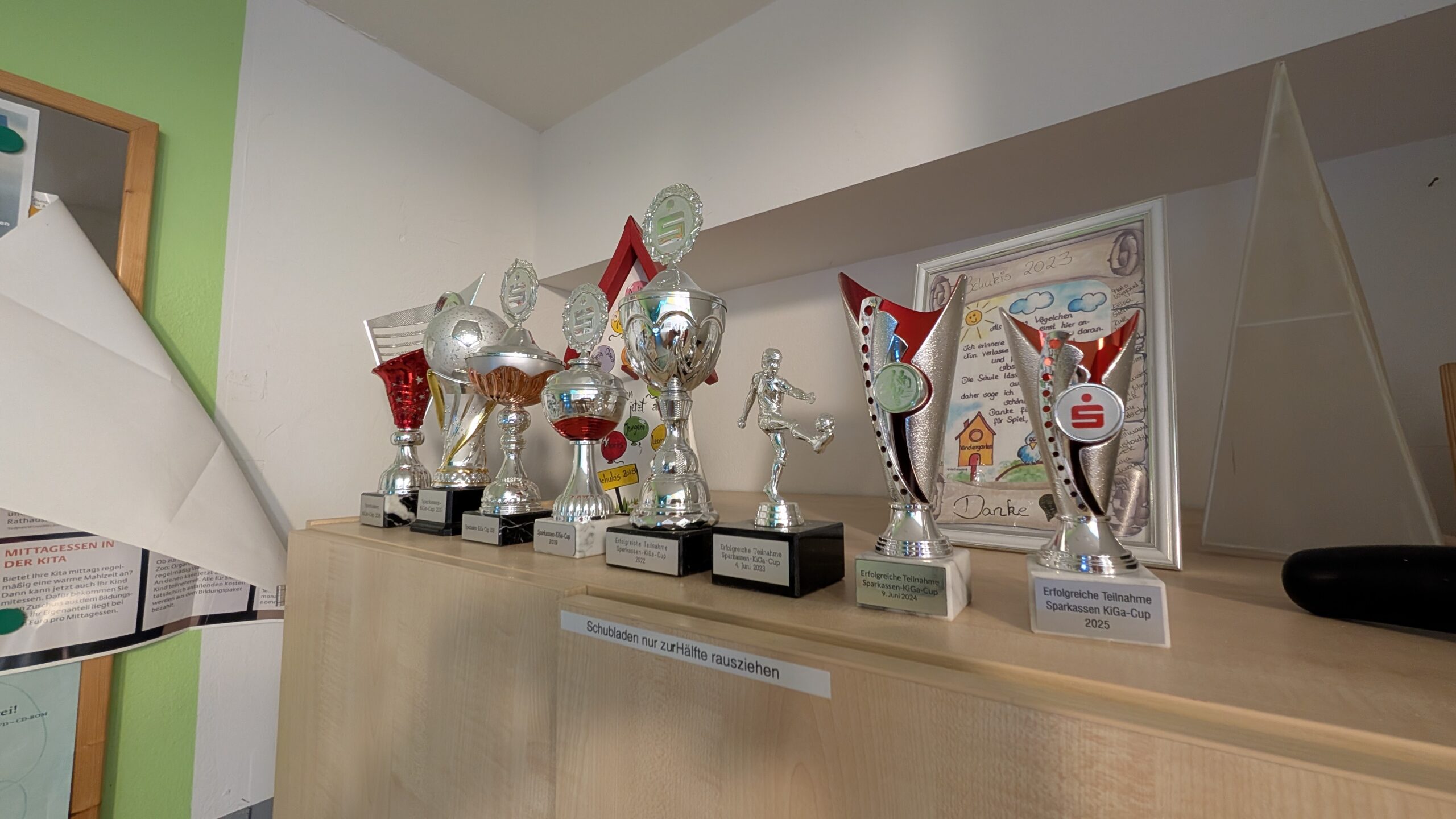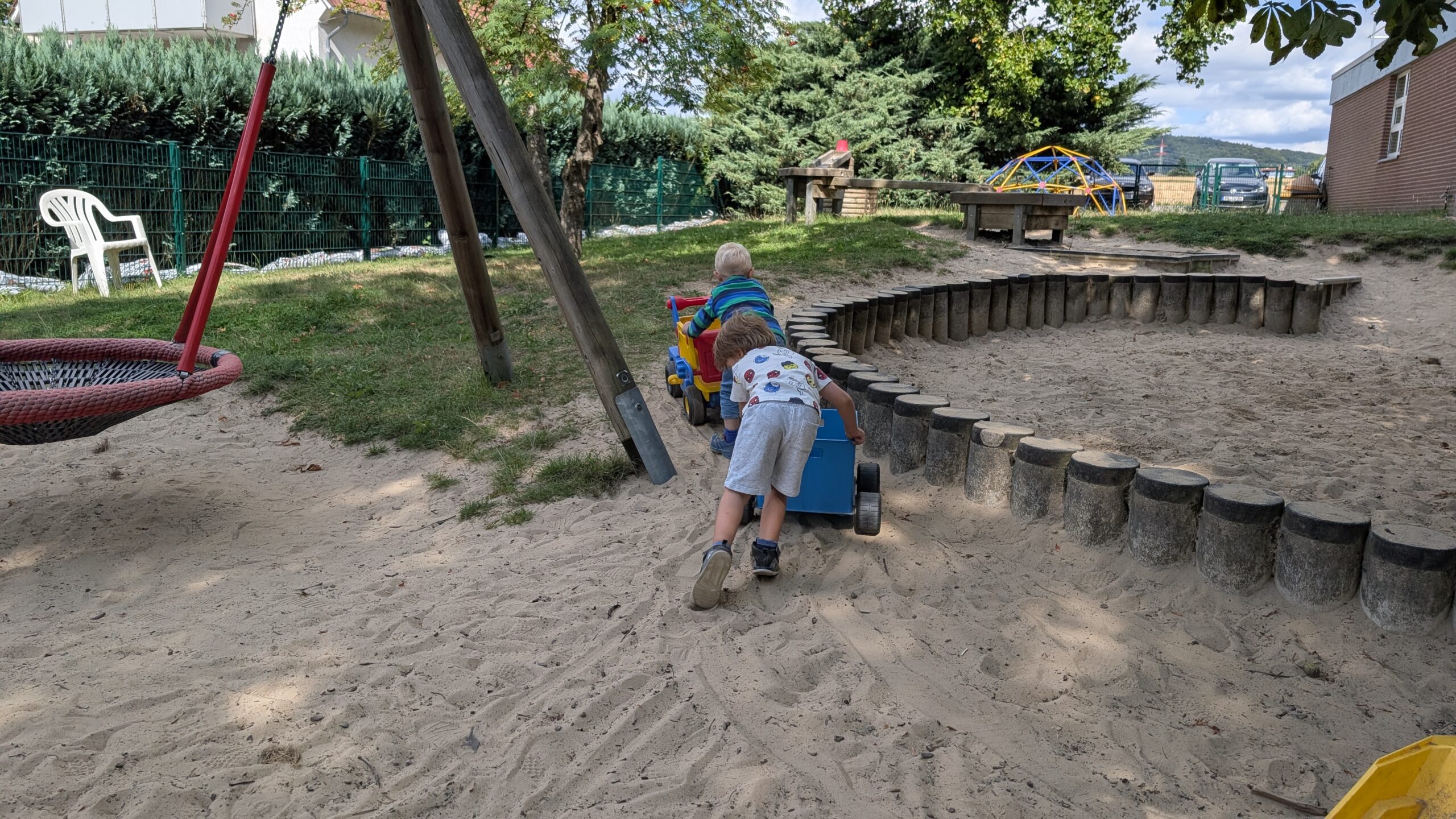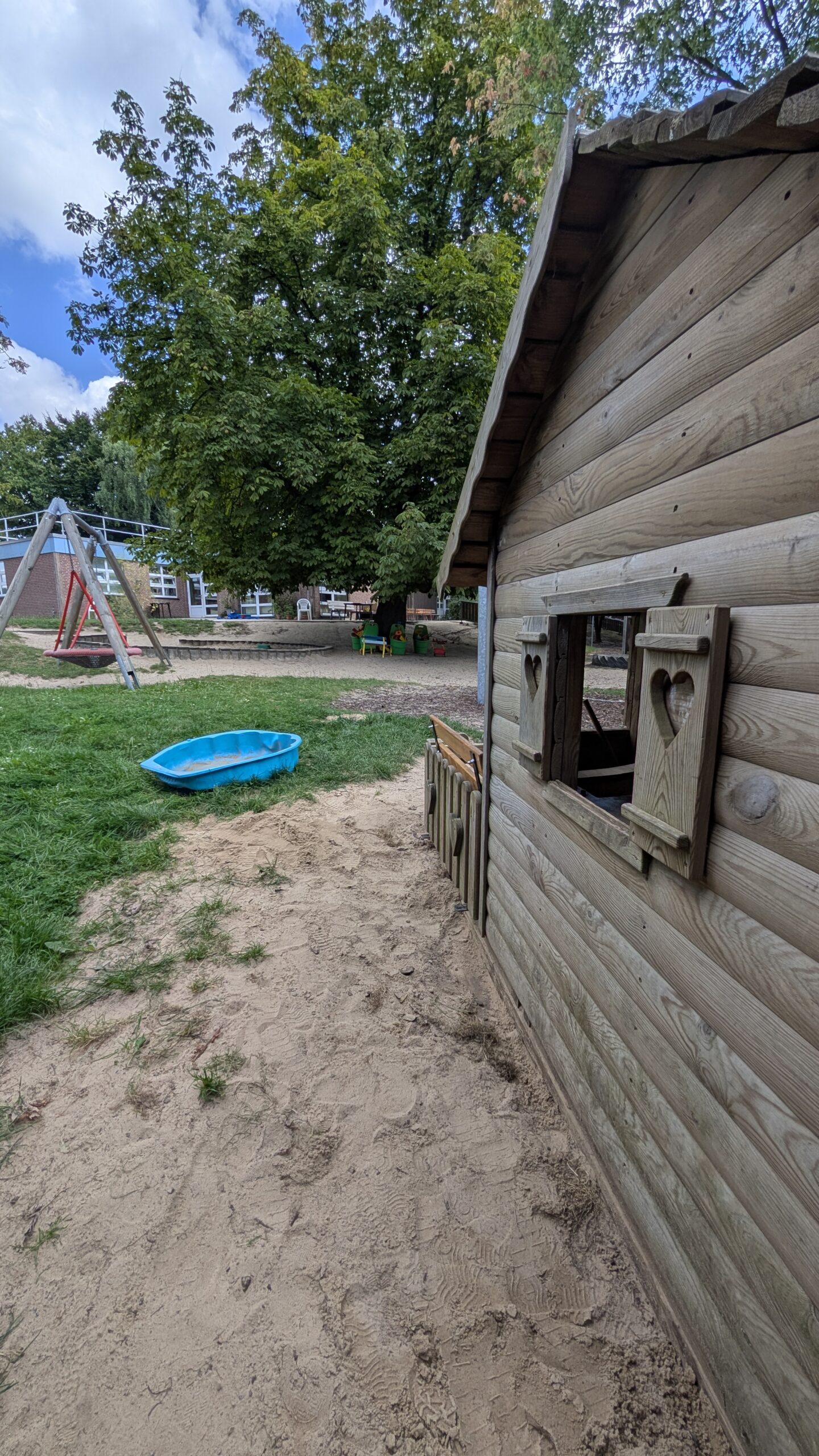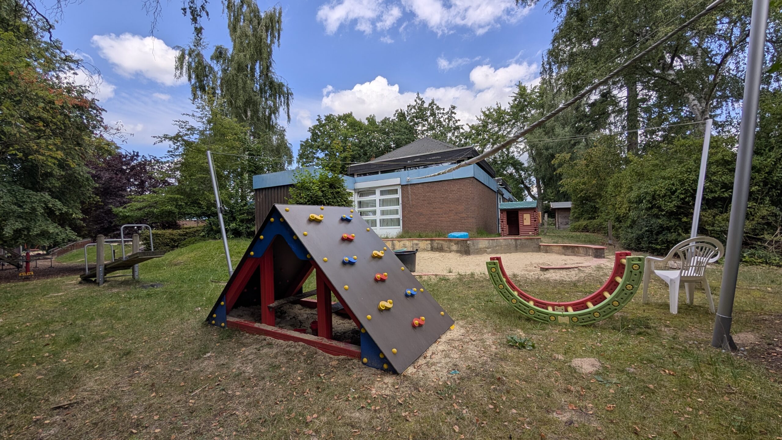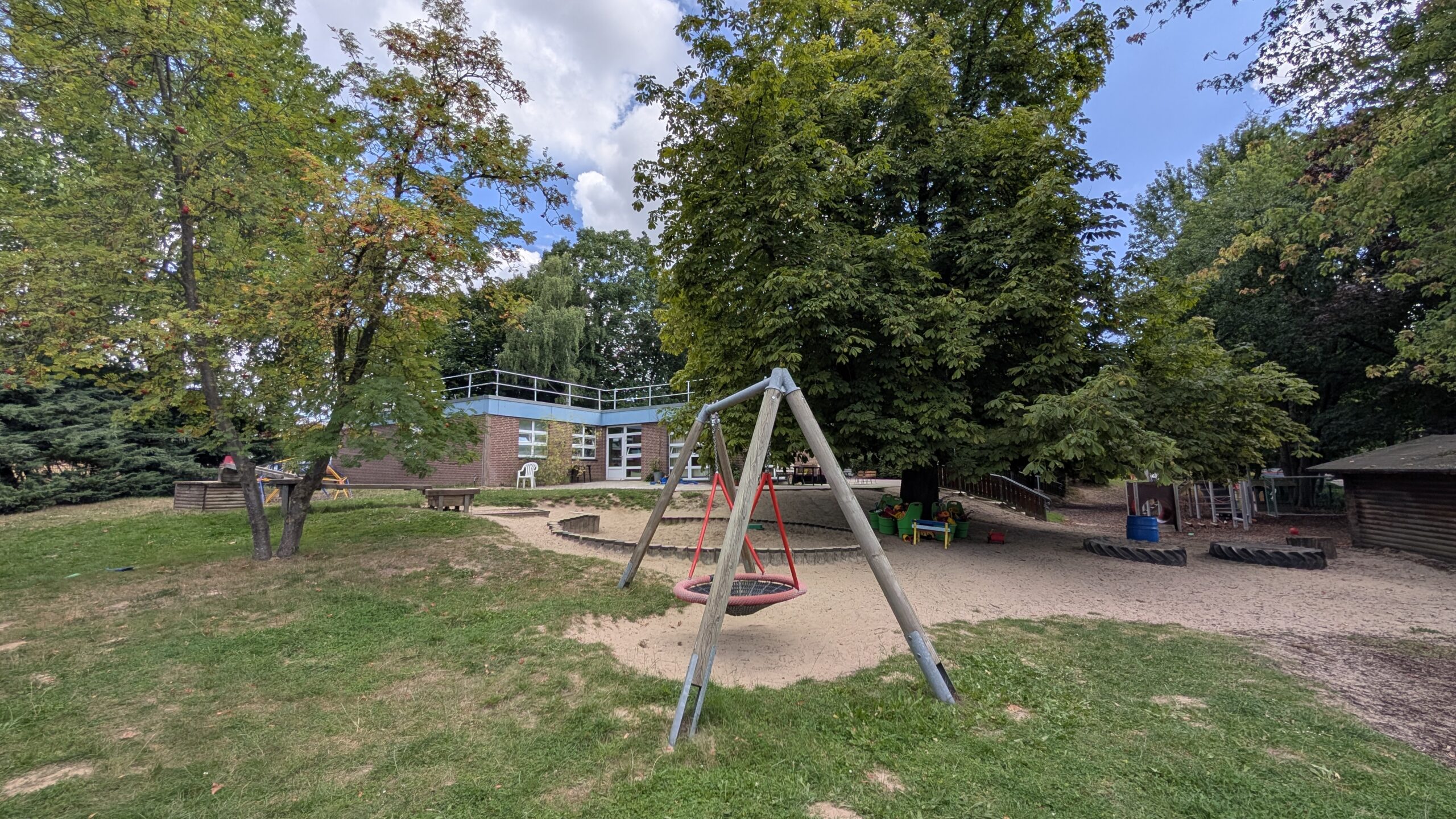 Das Außengelände ist großzügig angelegt und bietet Grünflächen, Spielgeräte, Sandbereiche sowie befestigte Wege, die für Roller, Dreiräder und andere Fahrzeuge genutzt werden können. Die ländliche Lage erlaubt es, Naturerfahrungen wie Spaziergänge, Feld- und Wiesenbesuche oder kleine Erkundungstouren regelmäßig in den Tagesablauf einzubinden.